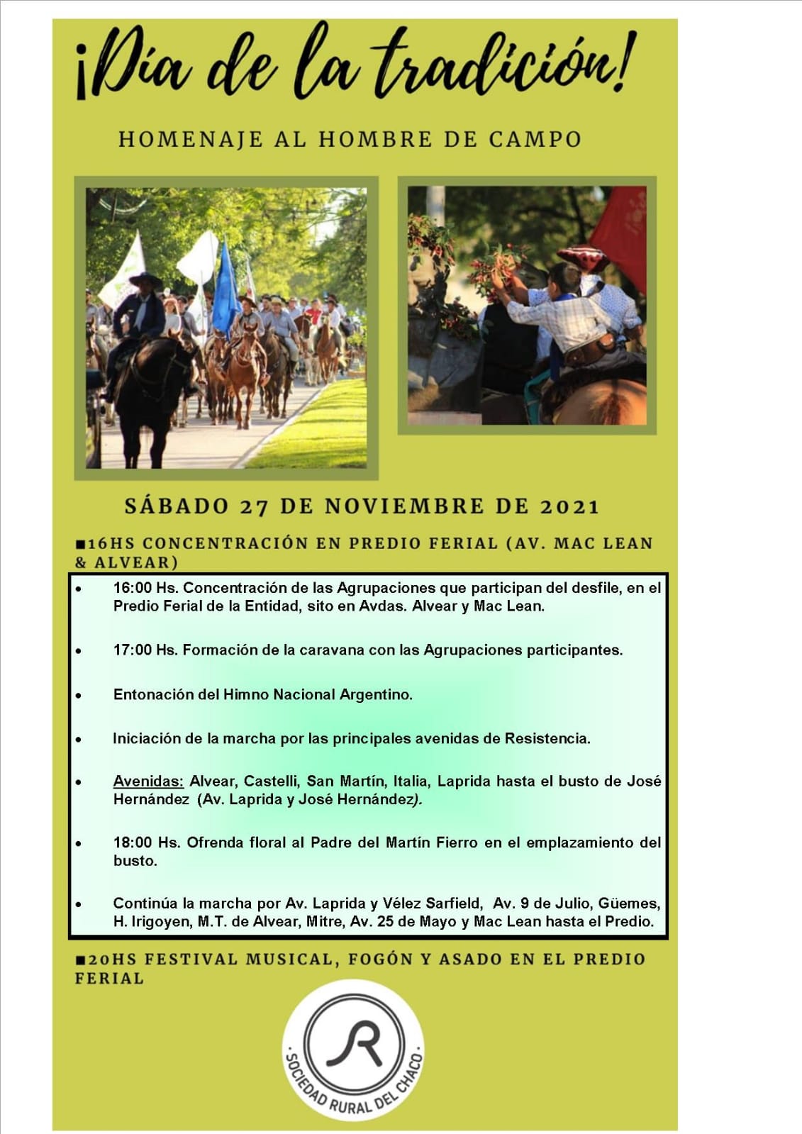 Esta fiesta, está prevista para el día 27 de Noviembre de 2021, el punto de partida de la Cabalgata será en el Predio Ferial de la Sociedad Rural del Chaco, de Avdas. Alvear y Mac Lean de regreso participarán importantes números artísticos.